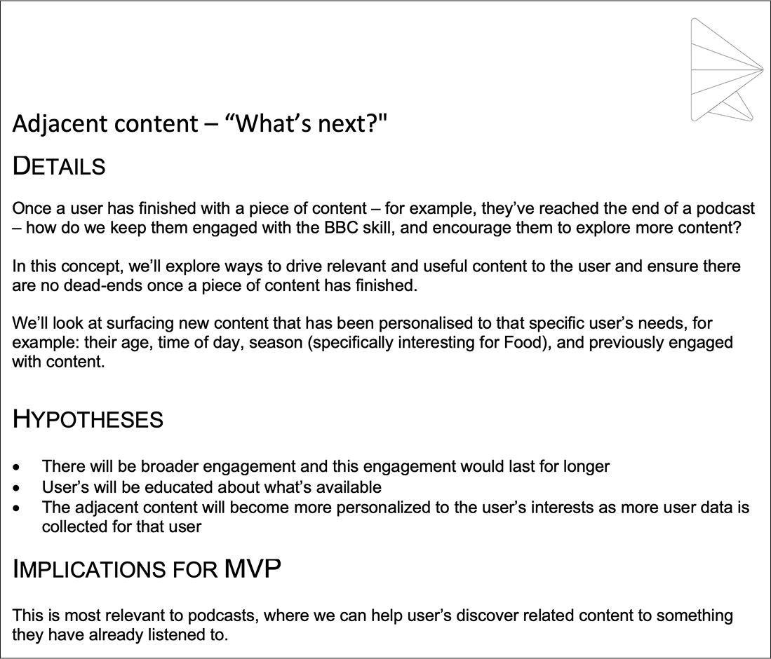 We handed over our work and recommendations and their in-house team took the project on from there to create the BBC Sounds VUI experience for all voice devices.